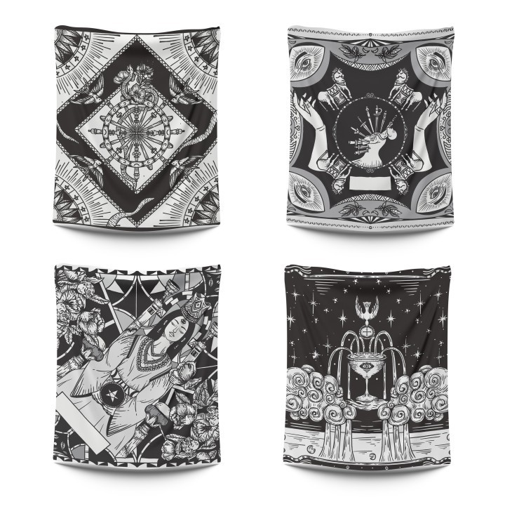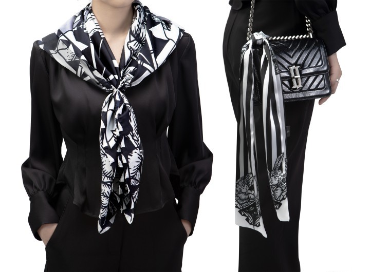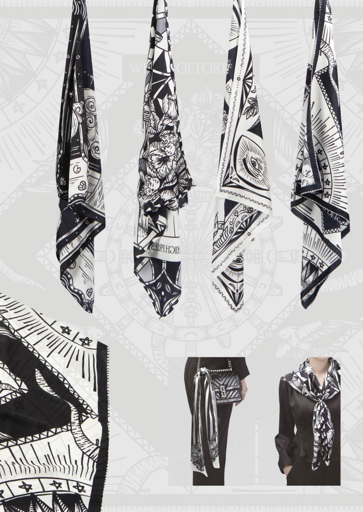 여황제 카드, 운명의 수레바퀴 등 각각의 카드의 특징을 담고 흑과 백, 음과 양, 모든 것에는 양면이 존재함을 보여주고 유니크한 그래픽으로 매력적이고 신비로운타로카드 스카프를 디자인하였습니다.