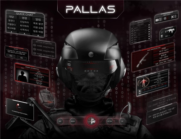 따라서 특수장비의 개발은 경찰의 생명을 보호하고 작전 수행의 효율성을 높이는 긴요성을갖추고 있다. 우리가 제안한 헬멧은 특수경찰이 효과적으로 인질 구조, 총기 사건, 테러 등의 상황을대처할 수 있도록 시스템을 구축하고, 장비를 최신 기술로 업그레이드하기 위해 디자인되었다.이를 위해 경찰의 안전과 효율성을 고려하여 경량화된 장비, 최신 IT 기술 적용, 작업중의 최적화가 필수적이다.팔라스는 그리스 신화에서 아테나가 팔라스를 죽인후 자신의 몸을 보호하기 위해 패한팔라스 몸을 벗겨 전투하는 이야기에서 영감을 받았다. 우리 제품은 경찰이 자신의 몸뿐아니라 다른 사람을 보호하는 역할을 담고 있다.